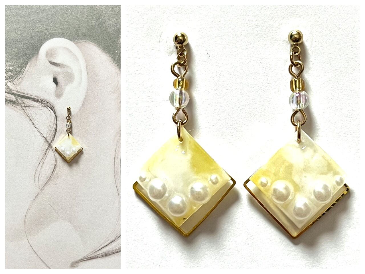 優しい黄色が耳元に柔らかな光を放ち、日常のスタイルに華やかさをもたらしてくれるピアスです。